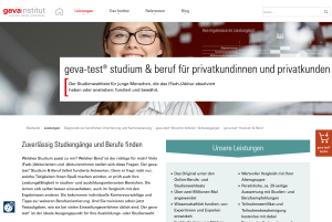Der geva-test® ist ein Instrument zur Erfassung individueller Kompetenzen und Präferenzen im Kontext der Berufs- und Studienwahl sowie der beruflichen Neuorientierung. Mithilfe dieses Tests können fundierte Entscheidungen bezüglich der Wahl eines geeigneten Studienfachs, einer adäquaten Berufsausbildung oder des optimalen Ausgangspunkts für die Ausbildungs- oder Studienwahl getroffen werden. Die Originalversion dieses Online-Tools zur Berufs- und Studienwahl wurde bis heute über zwei Millionen Mal angewendet und genießt somit einen exzellenten Ruf.